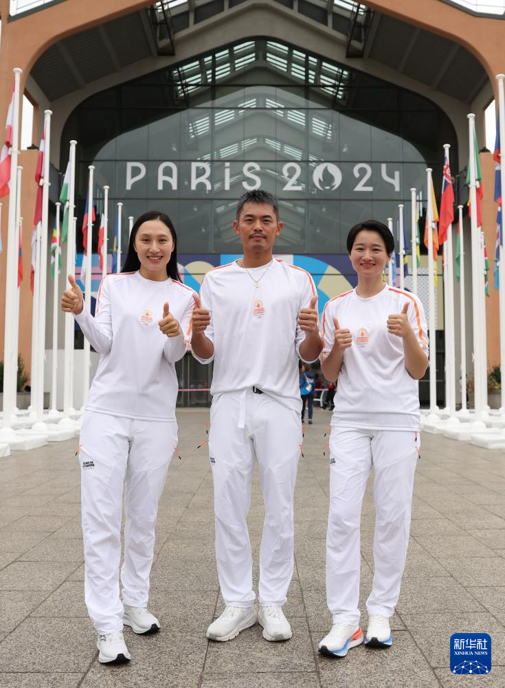 7月26日,参与火炬传递的国际奥委会委员张虹(左)、中国羽毛球奥运冠军林丹(中)和中国跆拳道奥运冠军吴静钰在火炬传递后合影。新华社记者 贾浩成 摄