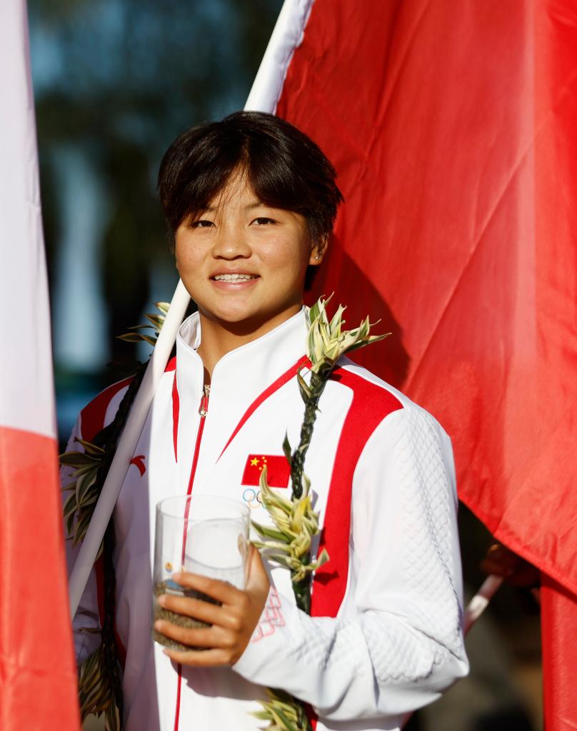 7月26日,第33届夏季奥林匹克运动会在法国巴黎开幕,巴黎奥运会冲浪项目举办地法属波利尼西亚的塔希提举办小型开幕仪式。图为在仪式现场的杨思琪。新华社记者 马平 摄