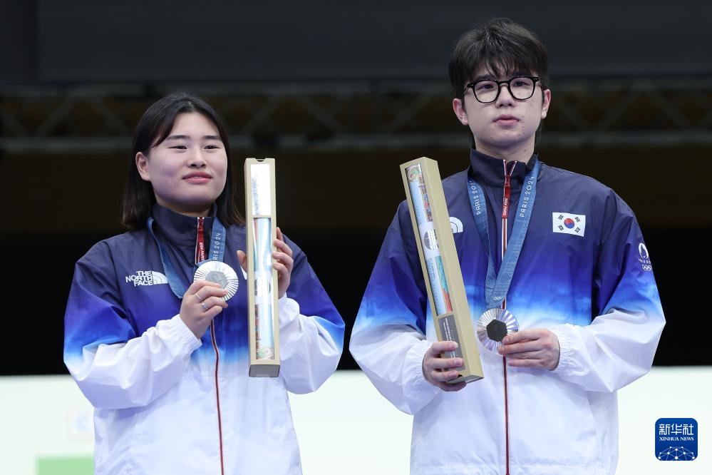7月27日,亚军韩国选手金智贤/朴是晙(右)在颁奖仪式上。新华社记者 赵丁喆 摄