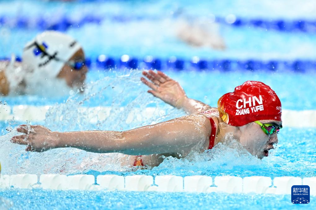 7月27日,中国选手张雨霏在女子100米蝶泳预赛中,她以56秒50的成绩晋级半决赛。新华社记者 杜宇 摄