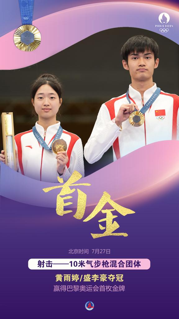 7月27日,在法国沙托鲁举行的巴黎奥运会射击10米气步枪混合团体决赛中,中国选手黄雨婷/盛李豪夺冠,赢得巴黎奥运会首枚金牌。