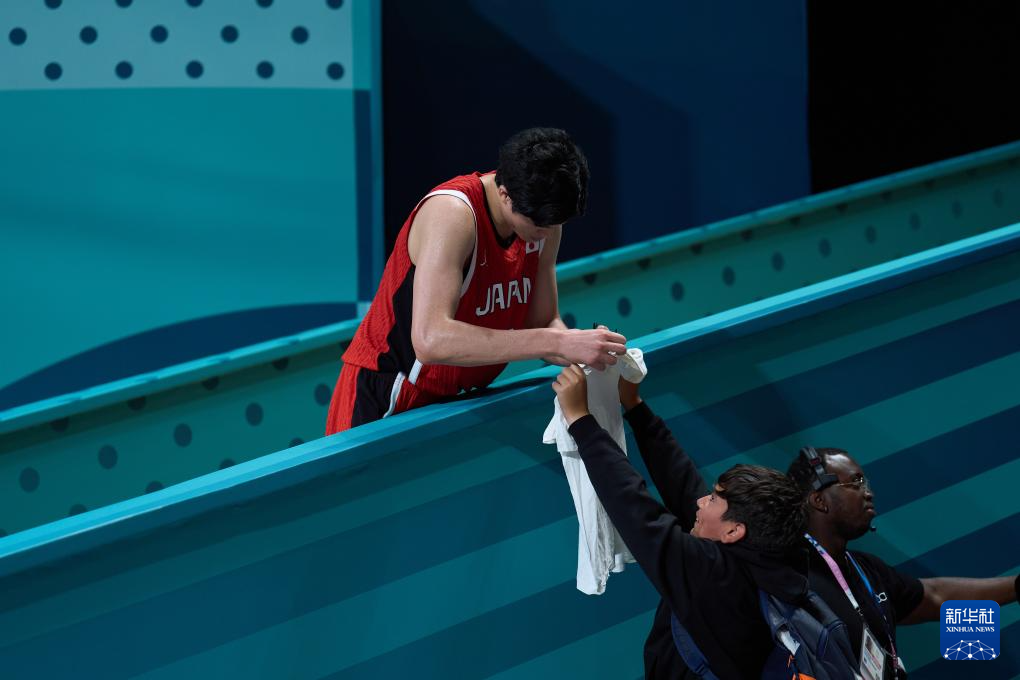 7月27日,日本队球员渡边雄太(上)在比赛后为球迷签名。新华社记者 孟鼎博 摄