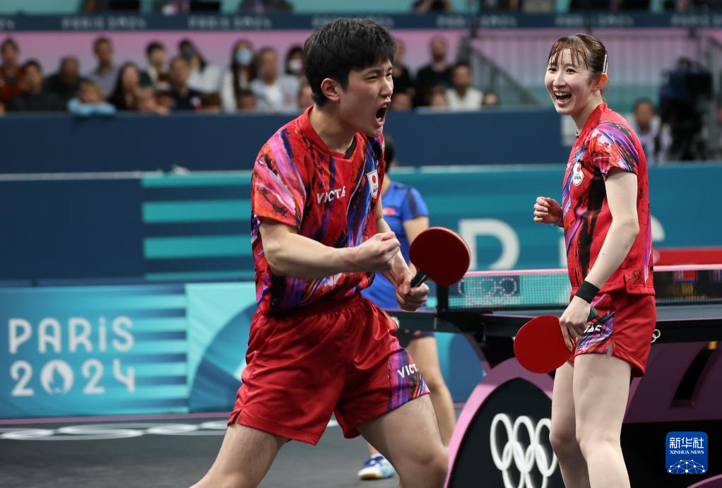 7月27日,张本智和(左)/早田希娜在比赛中庆祝得分。新华社记者 王东震 摄