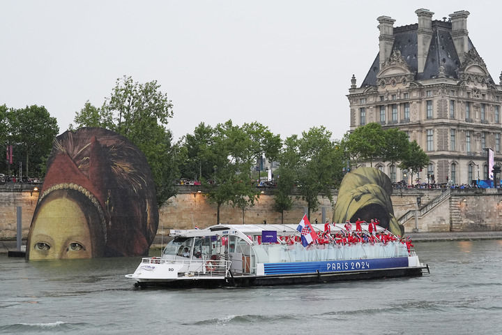 在开幕式上,各体育代表团乘坐船只,行驶在塞纳河上。我在塞纳河畔的点位等待,六个法国名画中的标志性面孔从水中浮现,注视着缓行的船只。
