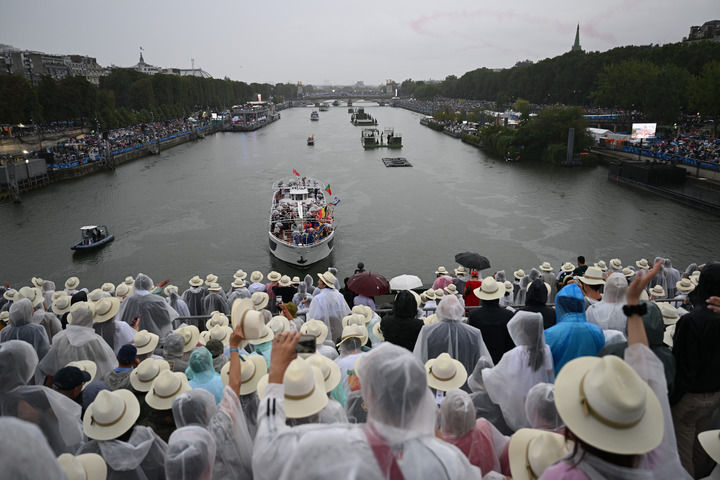 各代表团乘坐游船顺流而下,船队穿过座座桥梁,来到荣军院桥与阿尔玛桥之间的河段,现场欢乐的分贝再次提升。船上的人挥动旗帜与观众互动,人群中发出经久不息的欢呼声。