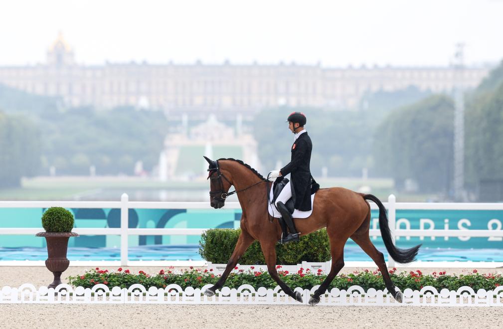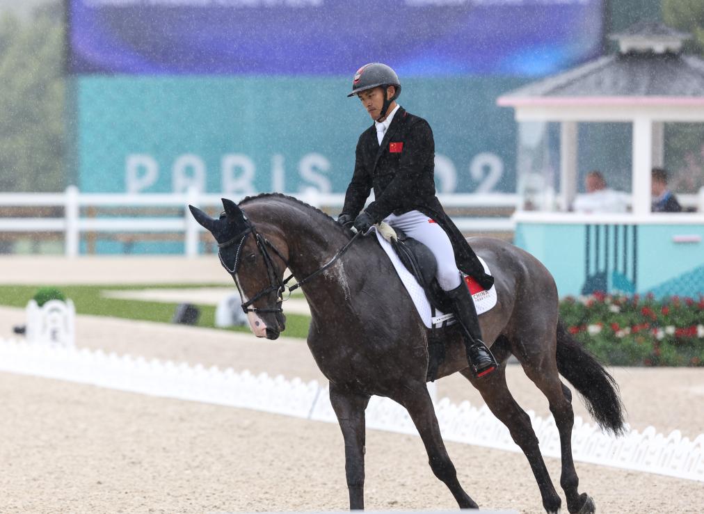 7月27日,中国选手孙华东在马术项目盛装舞步个人赛中。新华社记者 杨磊 摄