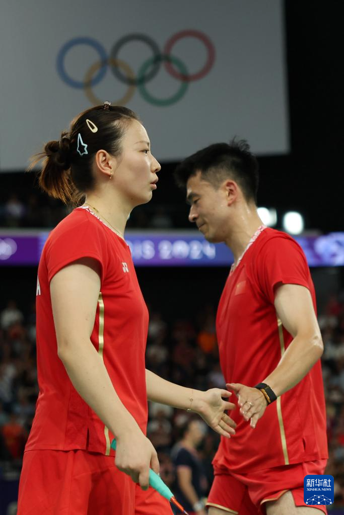 7月27日,郑思维/黄雅琼(左)在比赛中交流。新华社记者 陈斌 摄