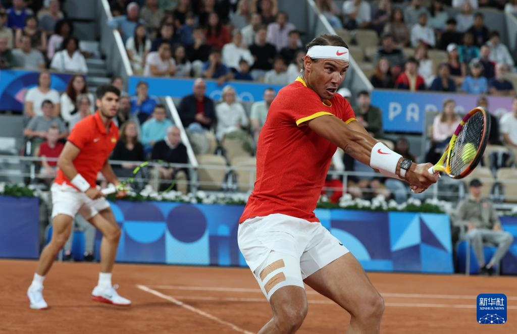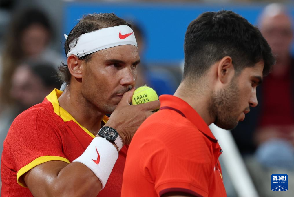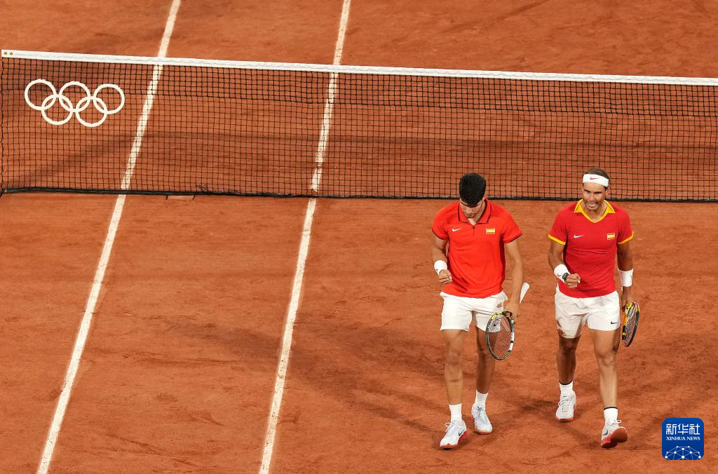 7月27日,阿尔卡拉斯/纳达尔(右)在比赛中。新华社记者 高静 摄