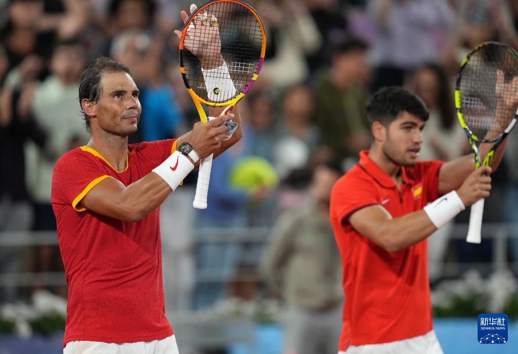 7月27日,阿尔卡拉斯/纳达尔(左)在赛后向观众致意。新华社记者 万象 摄
