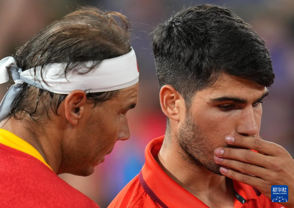 7月27日,阿尔卡拉斯(右)/纳达尔在比赛中交流。新华社记者 万象 摄