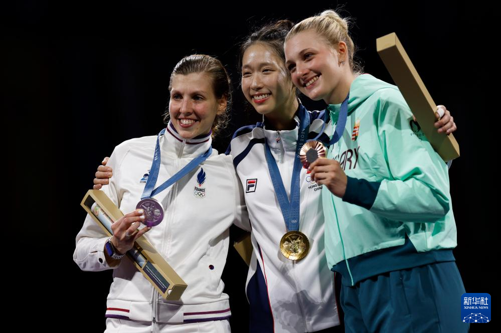 7月27日,冠军中国香港选手江旻憓(中)、亚军法国选手马洛-布雷东(左)和季军匈牙利选手穆豪里在颁奖仪式上合影。新华社记者 费茂华 摄