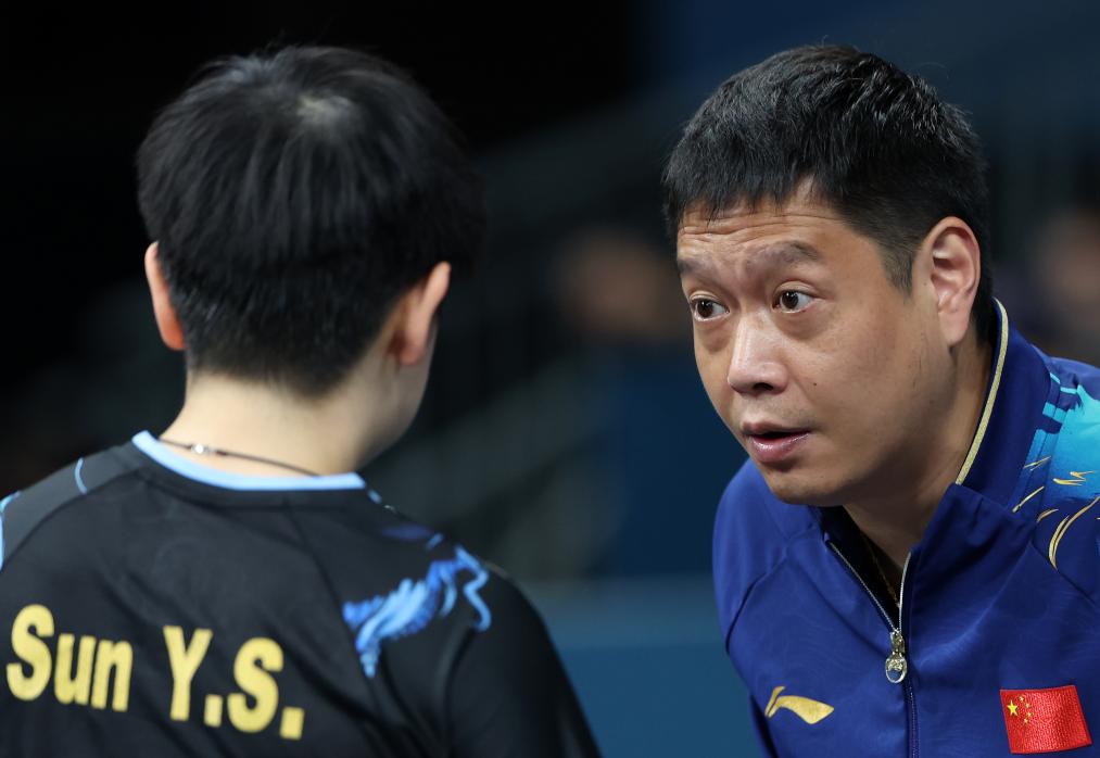 7月28日,孙颖莎(左)在比赛中接受教练邱贻可的指导。新华社记者 王东震 摄