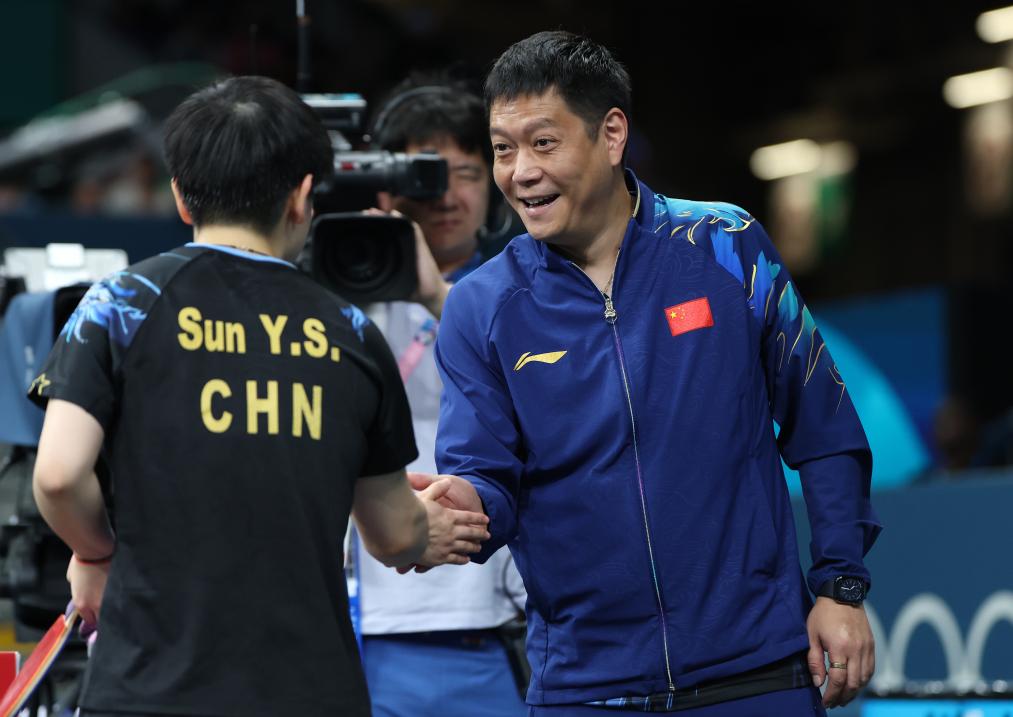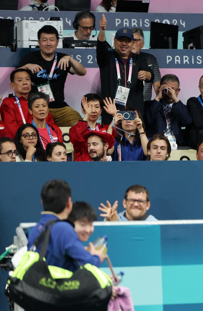 7月28日,中国乒乓球协会主席刘国梁为孙颖莎竖起大拇指。新华社记者 王东震 摄