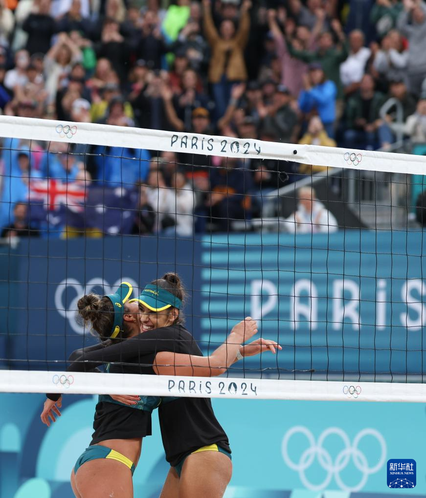 7月27日,澳大利亚组合阿塔乔·德尔·索拉尔(左)/克兰西庆祝比赛获胜。新华社记者 黄宗治 摄