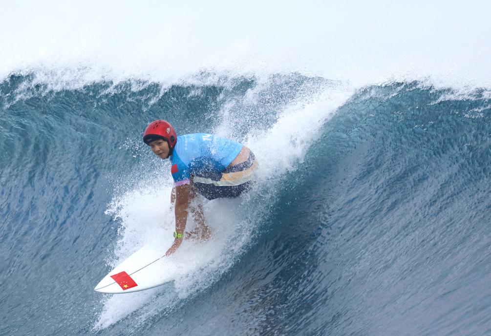 比赛开始,15岁的中国女孩又成为同组3人中第一位抓到浪的选手。她起乘滑行,只可惜最后未能冲出这道管浪。“第一道浪没有完成的原因,是自己并没有抓板沿,以为要出来的时候就被浪给扣了。”她说。