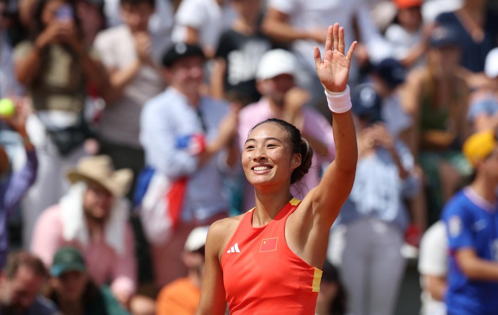 7月28日,中国选手郑钦文庆祝胜利。新华社记者 高静 摄