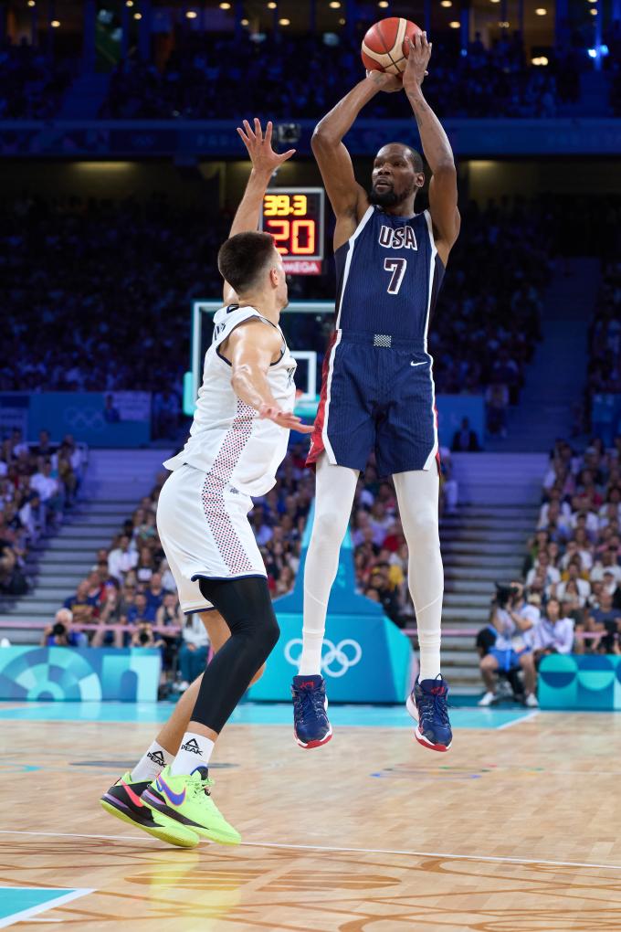 男篮比赛当日进行了C组的两场比赛。在与美国队的较量中,塞尔维亚开场打出10:2取得领先,但很快便被对手的“三分雨”淹没。杜兰特在不到10分钟的时间里8投8中,并在半场结束时命中压哨中投,帮助美国队58:49领先。本场比赛,美国全队命中18记三分球,杜兰特得到全场最高的23分。