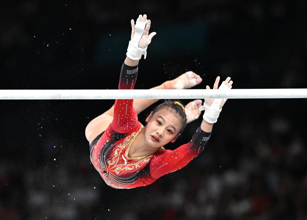 7月28日,中国选手邱祺缘在高低杠比赛中。新华社记者 程敏 摄