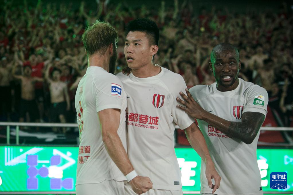 7月28日,成都蓉城队球员杨一鸣(中)在比赛中进球后与队友庆祝。新华社记者 江汉 摄