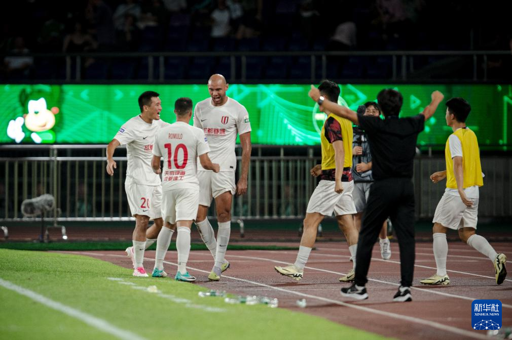 7月28日,成都蓉城队球员费利佩(左三)在比赛中庆祝进球。新华社记者 江汉 摄