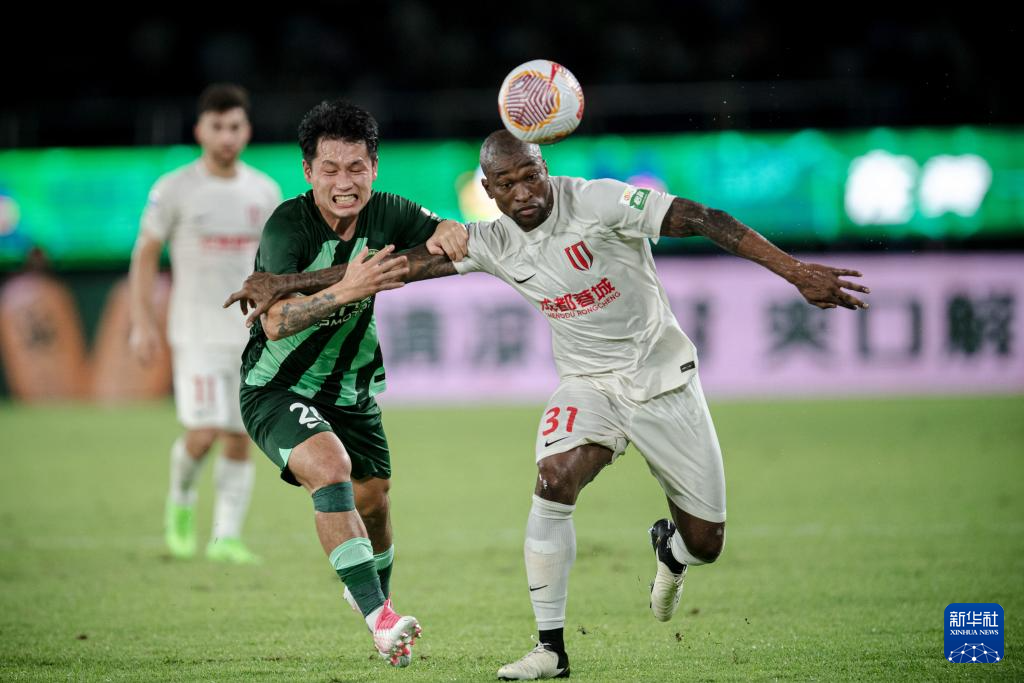 7月28日,成都蓉城队球员唐淼(下)在比赛中与浙江队球员孙国文拼抢。新华社记者 江汉 摄