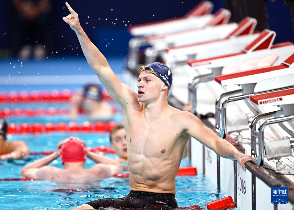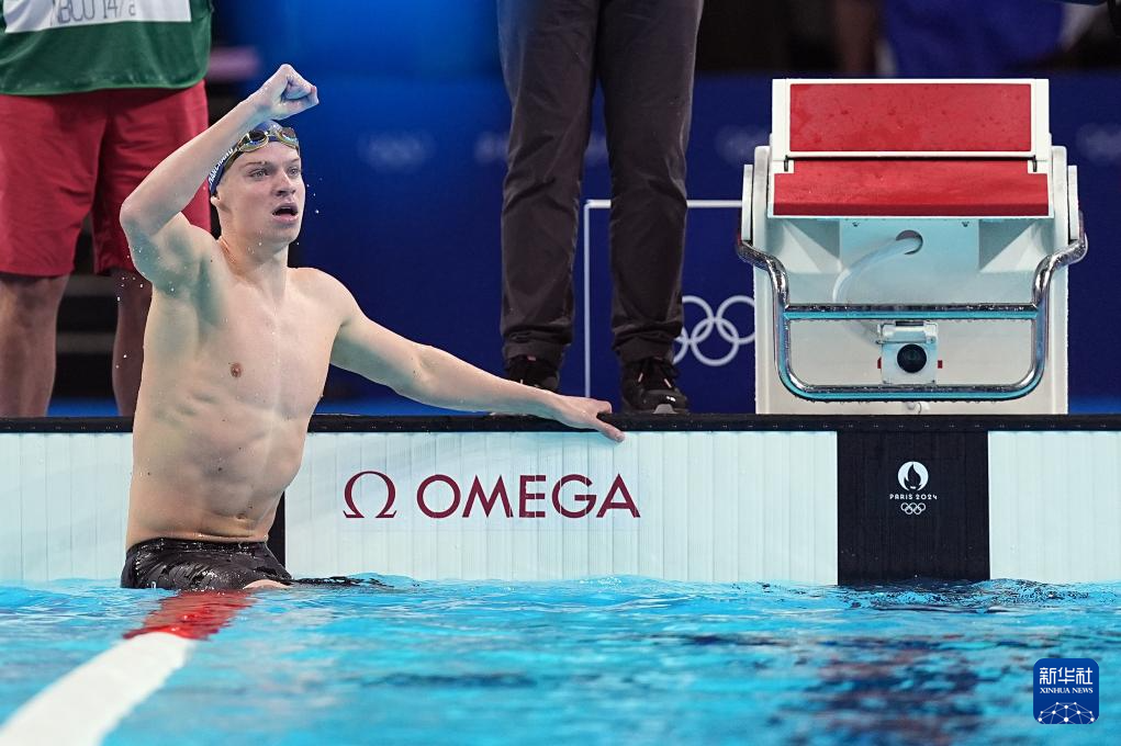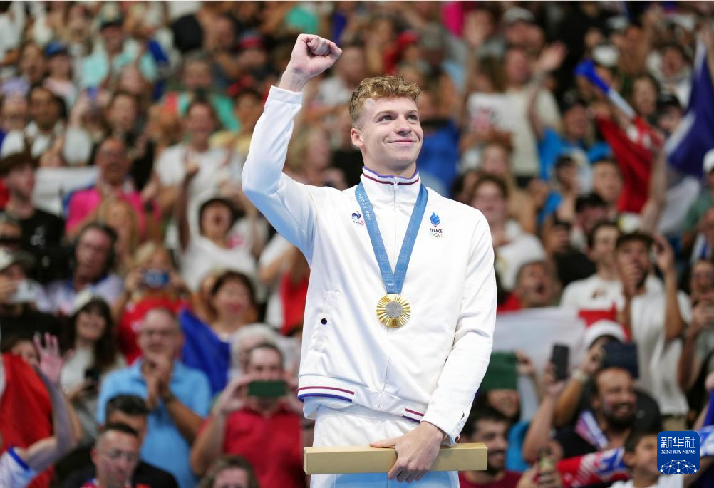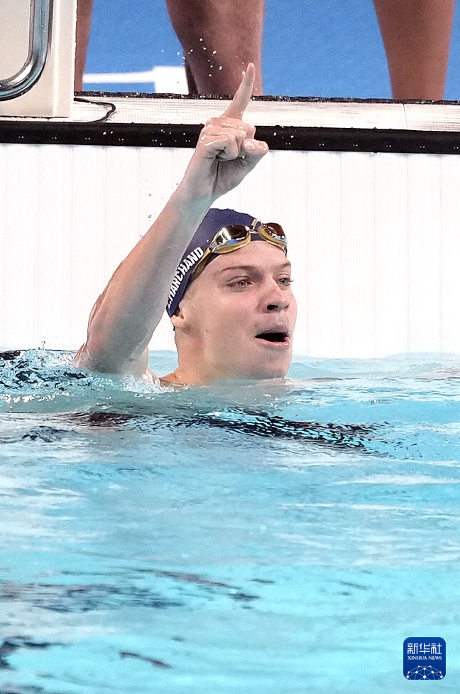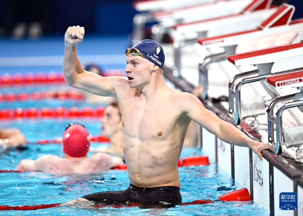 7月28日,法国选手马钱德在比赛后庆祝。他以4分2秒95的成绩夺冠并打破奥运纪录。新华社记者 杜宇 摄