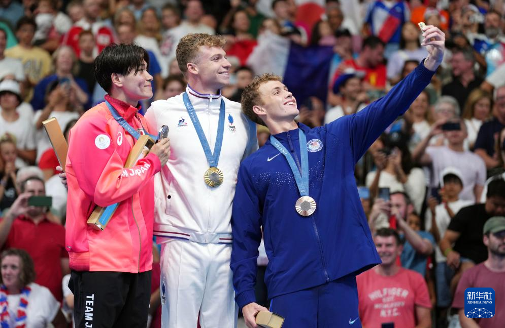 7月28日,冠军法国选手马钱德(中)、亚军日本选手松下知之(左)、季军美国选手福斯特在颁奖仪式上自拍。新华社记者 杜宇 摄