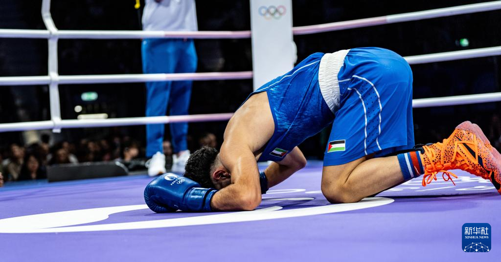 7月28日,巴勒斯坦选手阿布萨勒在与瑞典选手易卜拉欣的比赛后亲吻场地。最终,阿布萨勒不敌易卜拉欣。新华社记者 江文耀 摄