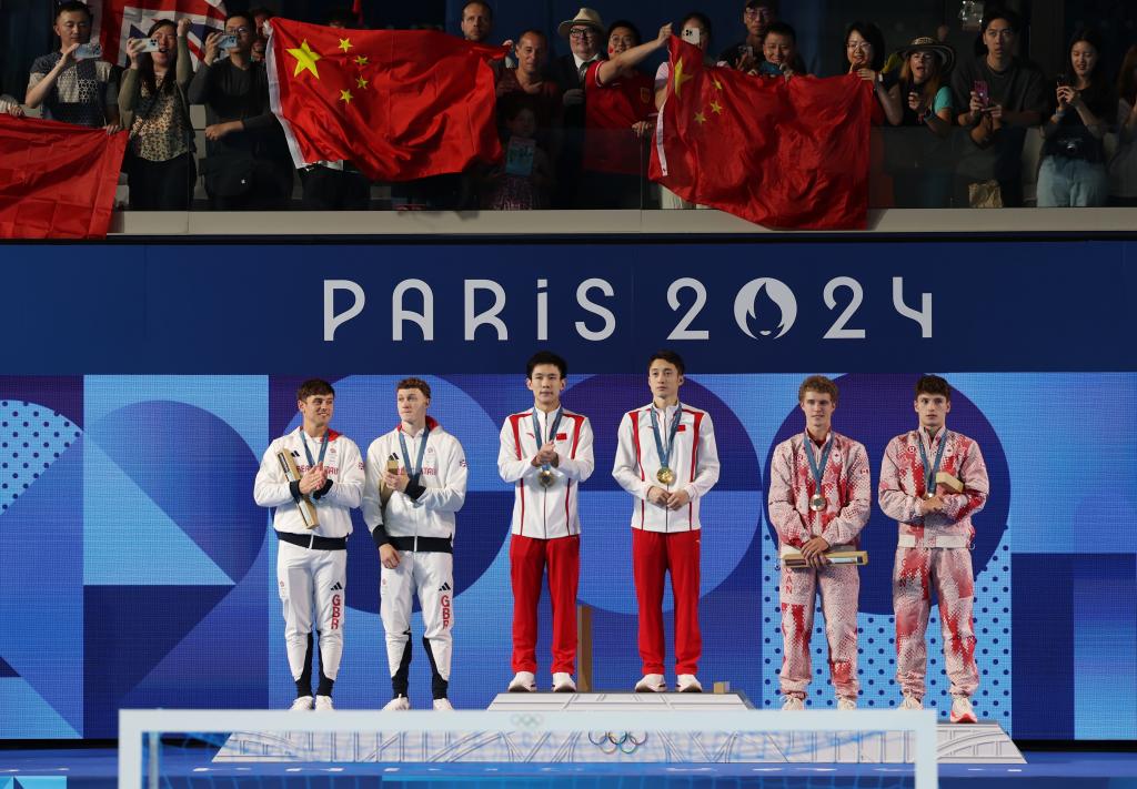 7月29日,冠军中国选手练俊杰(左四)/杨昊(左三)、亚军英国选手戴利(左一)/威廉姆斯(左二)、季军加拿大选手维恩斯(右二)/容博尔-穆雷(右一)在颁奖仪式上。新华社记者 李颖 摄