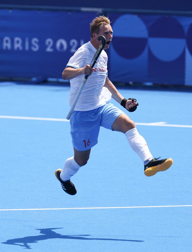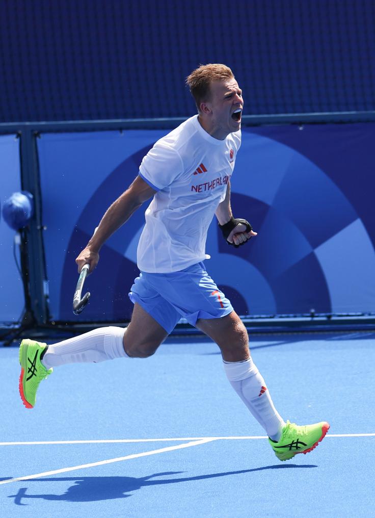 7月30日,荷兰队球员泰斯·范·丹进球后庆祝。