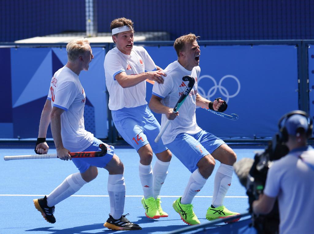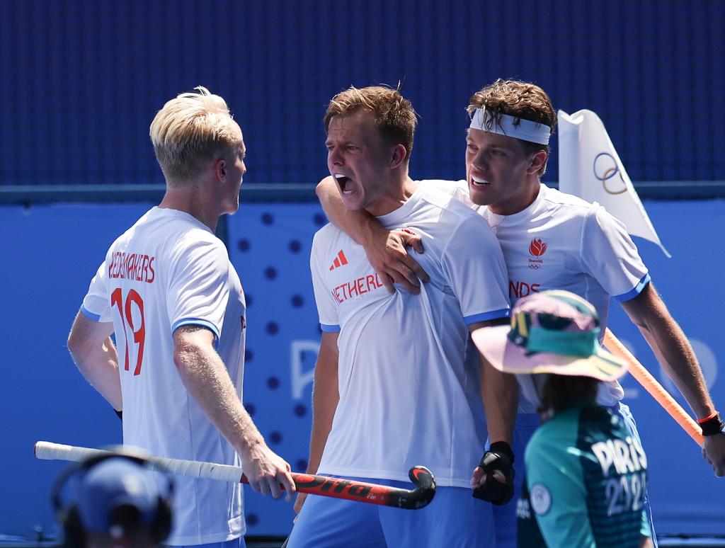 7月30日,荷兰队球员泰斯·范·丹(中)进球后庆祝。