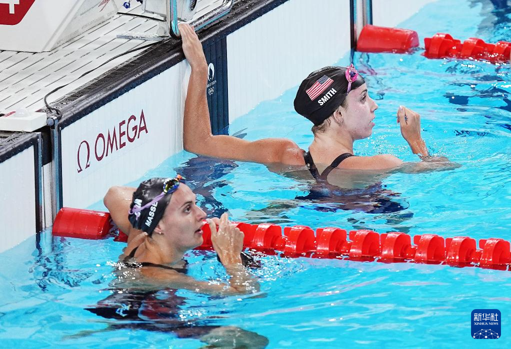 7月29日,美国选手史密斯(右)在比赛后查看成绩。她以半决赛第一的成绩晋级决赛。