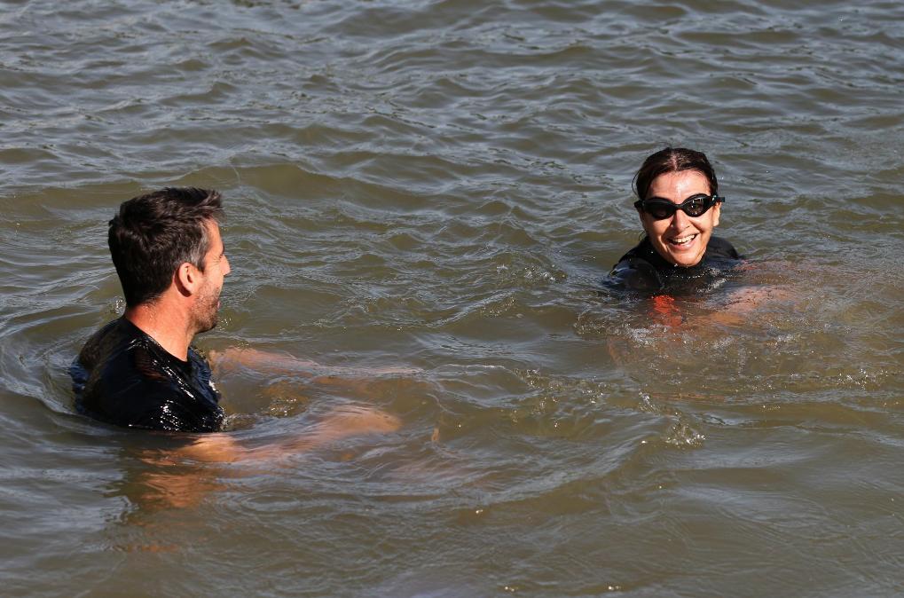 7月17日,巴黎市长伊达尔戈(右)和巴黎奥组委主席埃斯坦盖在塞纳河中游泳。新华社记者高静摄