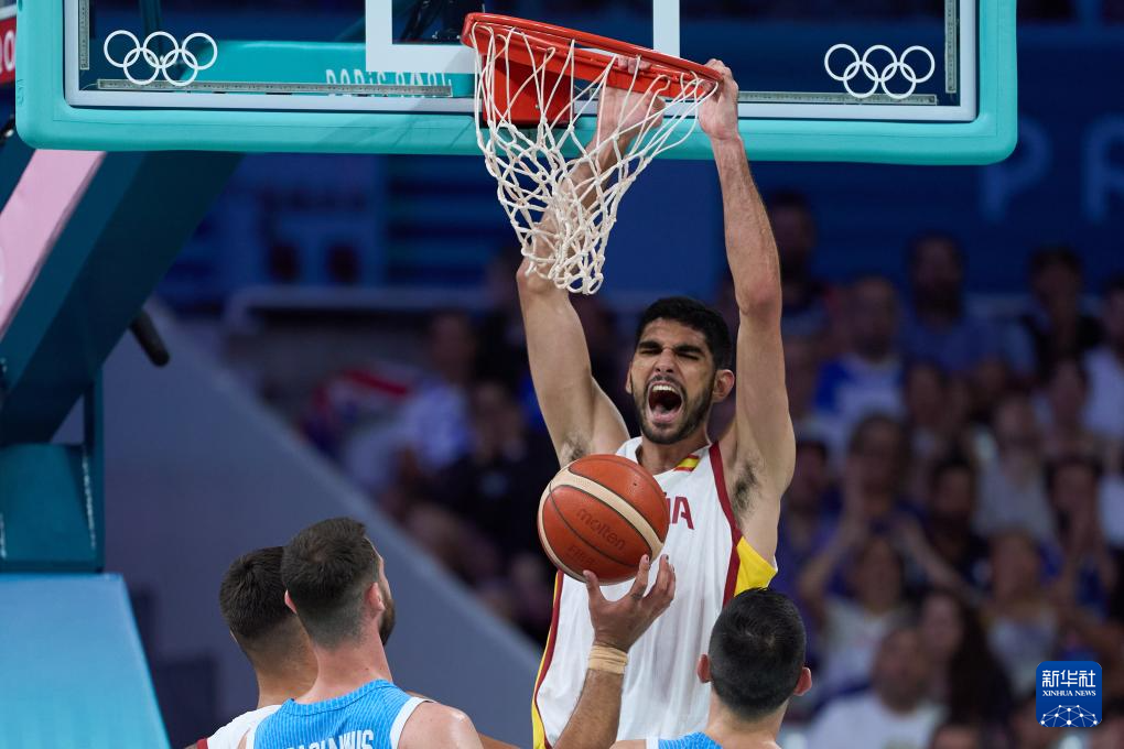 7月30日,西班牙队球员阿尔达马在比赛中扣篮得分。新华社记者 孟鼎博 摄
