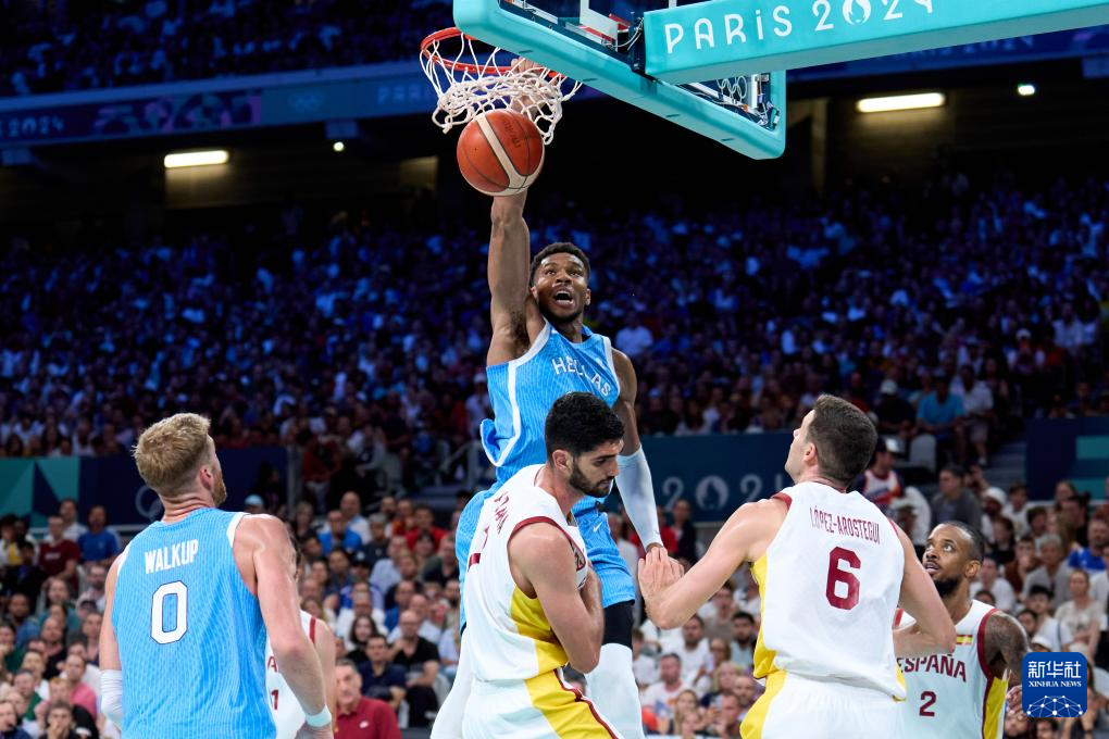 7月30日,希腊队球员安特托昆博(上)在比赛中扣篮。新华社记者 孟鼎博 摄