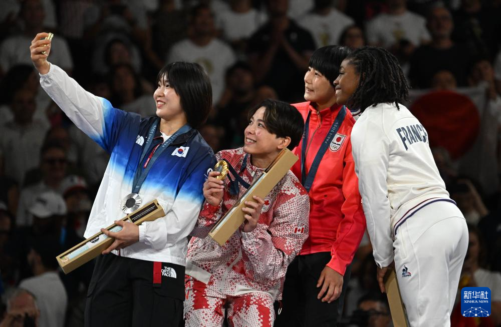 7月29日,冠军加拿大选手克丽斯塔·德桂(左二)、亚军韩国选手许美美(左一)和季军日本选手舟久保遥香(右二)、法国选手西西克在颁奖仪式上自拍。