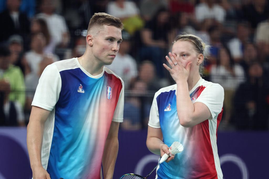 7月27日,吉凯尔/德尔吕(右)在比赛中交流。当日,在巴黎奥运会羽毛球项目混合双打小组赛A组比赛中,中国组合郑思维/黄雅琼2:0战胜法国组合吉凯尔/德尔吕。新华社记者 陈斌 摄