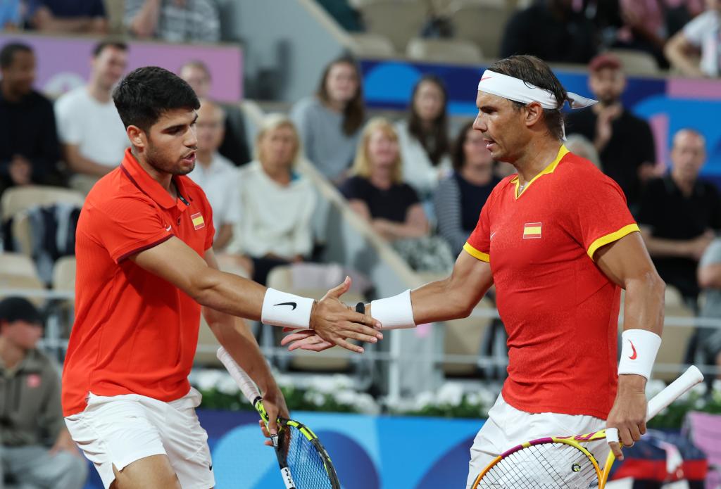 7月27日,阿尔卡拉斯(左)/纳达尔在比赛中庆祝得分。新华社记者 高静 摄