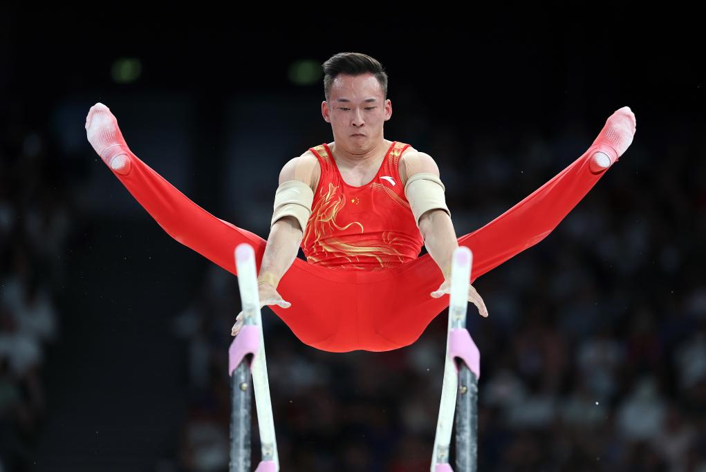 7月29日,中国队选手肖若腾在巴黎奥运会体操男子团体决赛双杠比赛中。新华社记者 曹灿 摄