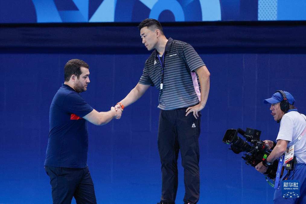 7月30日,张亮(中)在比赛后与一名工作人员握手。新华社记者 张玉薇 摄