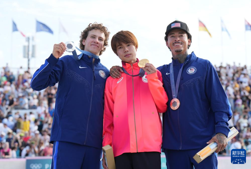 7月29日,冠军日本选手堀米雄斗(中)、亚军美国选手贾格尔·伊顿(左)、季军美国选手尼贾·休斯顿在颁奖仪式上合影。