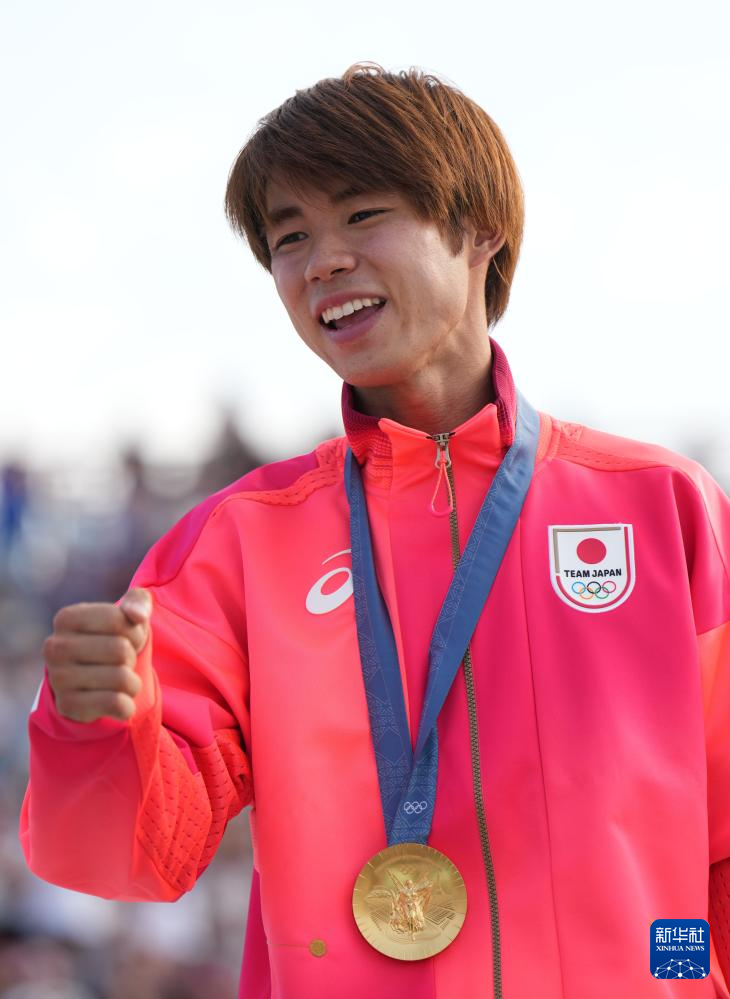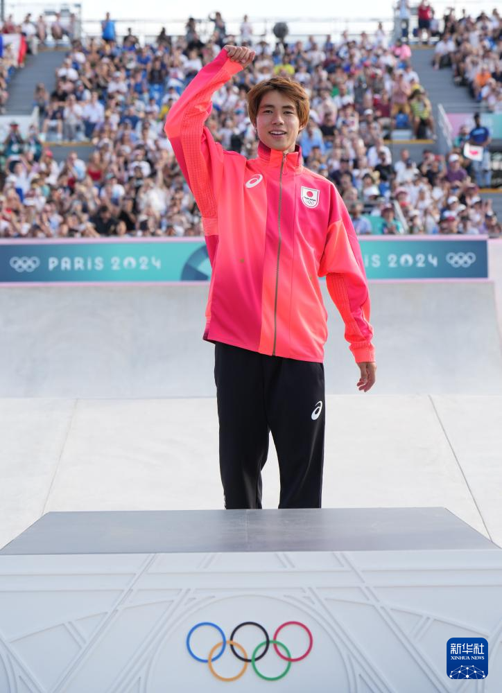 7月29日,冠军日本选手堀米雄斗在颁奖仪式上庆祝。