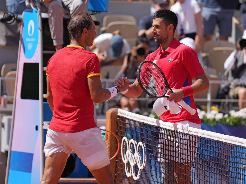 7月29日,纳达尔(左)与焦科维奇在赛后握手。 新华社记者 万象 摄
