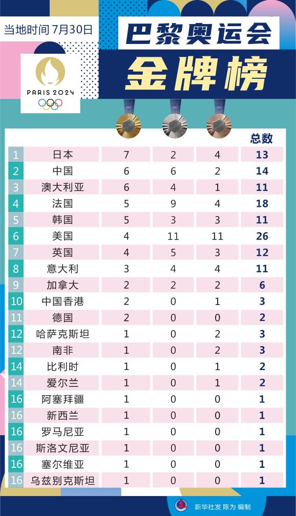 巴黎奥运会|7月30日巴黎奥运会金牌榜_2024巴黎奥运会_新华网