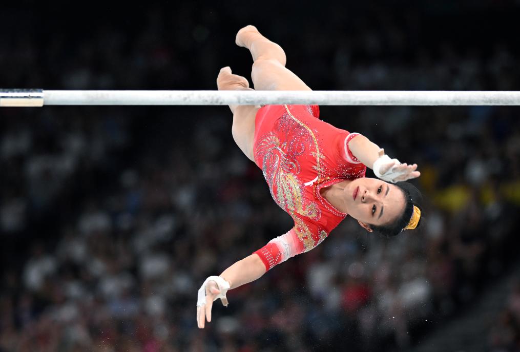 7月30日,中国队选手罗欢在高低杠比赛中。 新华社记者 程敏 摄