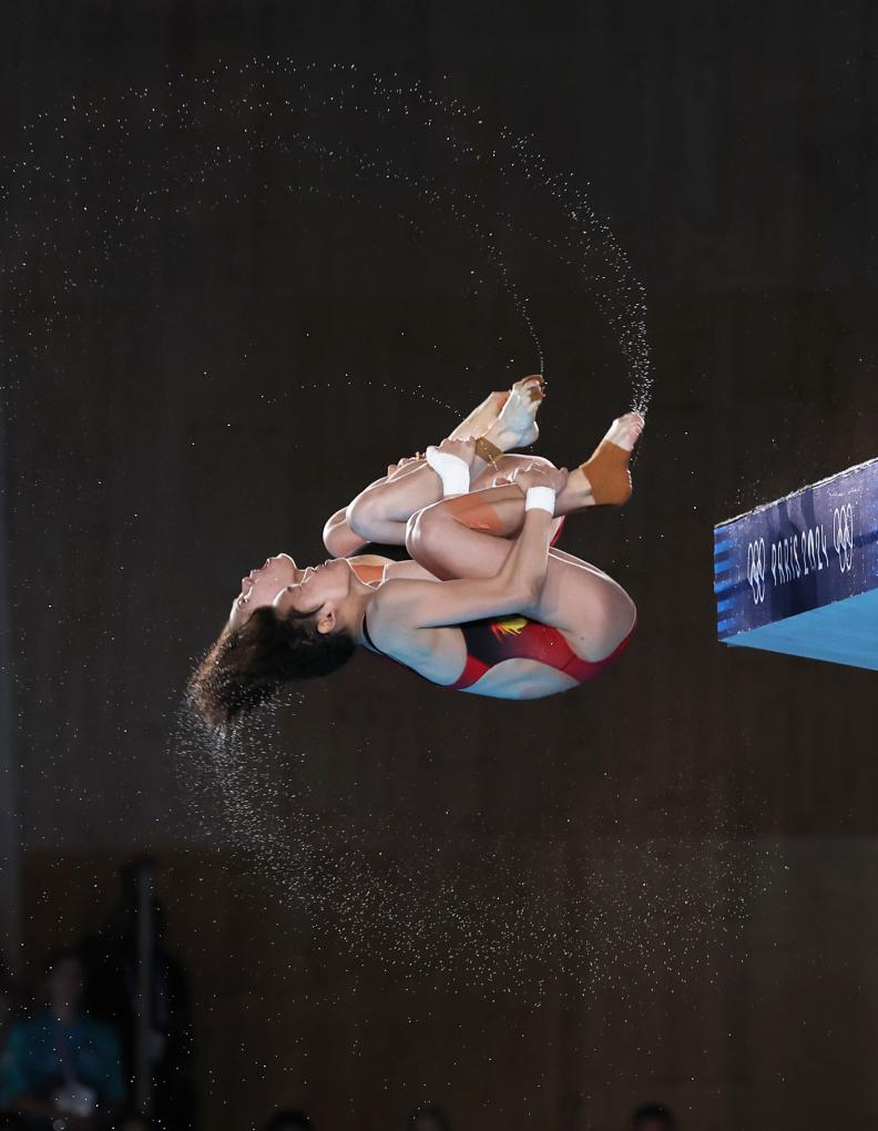 7月31日,中国选手陈芋汐/全红婵(前)在比赛中。新华社记者 李颖 摄