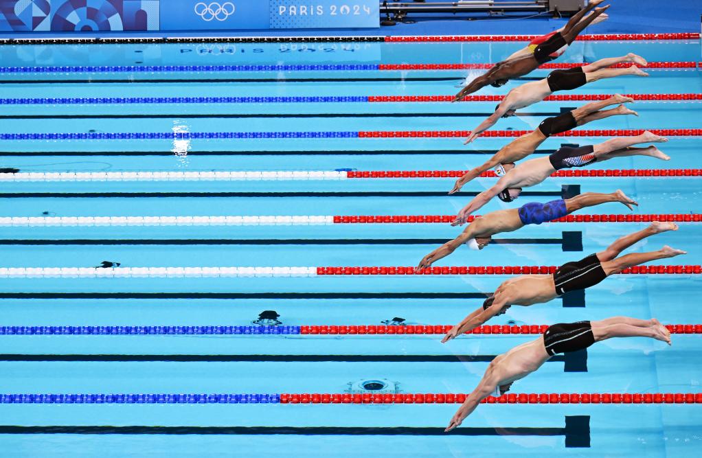 当日,巴黎奥运会游泳男子100米自由泳半决赛在拉德芳斯体育馆举行。