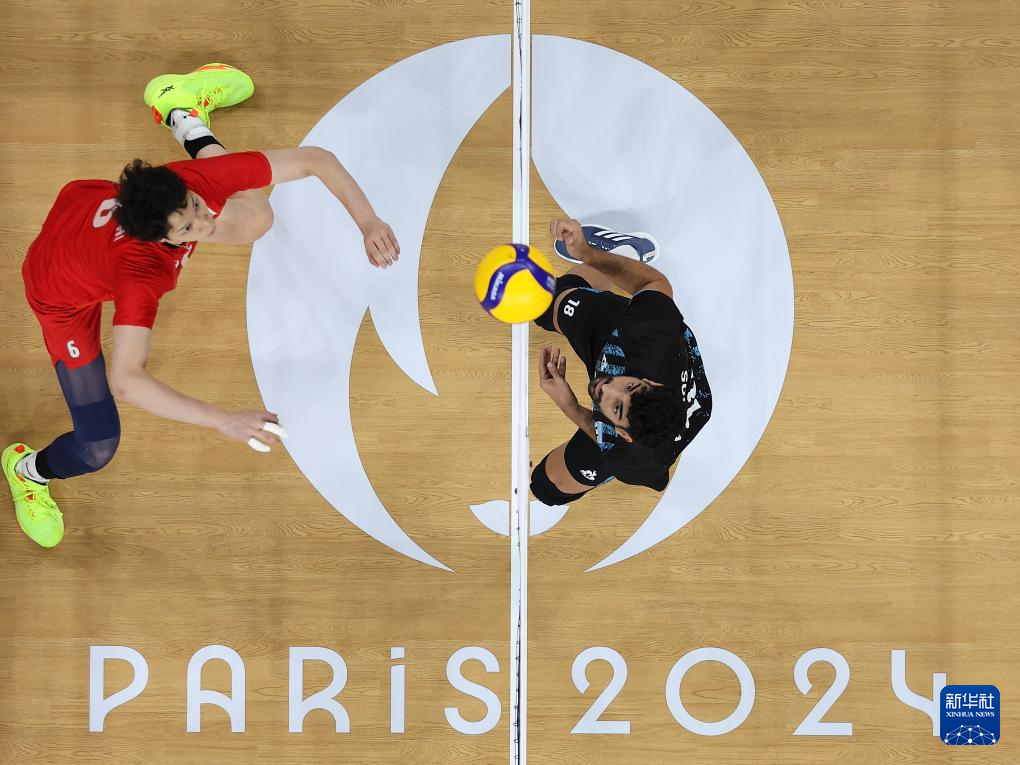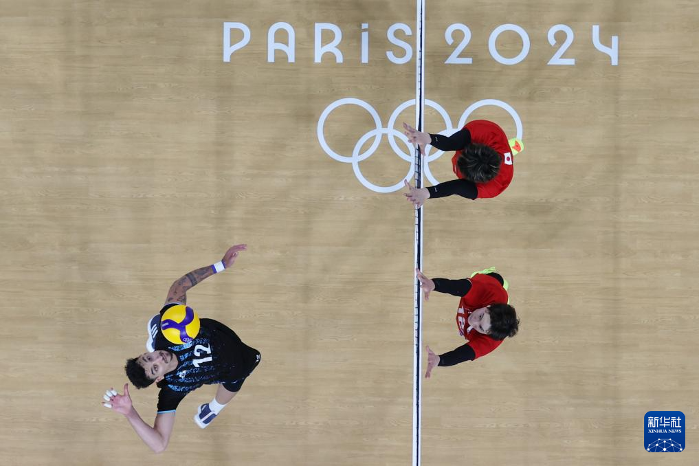 7月31日,阿根廷队球员利马(左下)在比赛中扣球。新华社记者 徐子鉴 摄