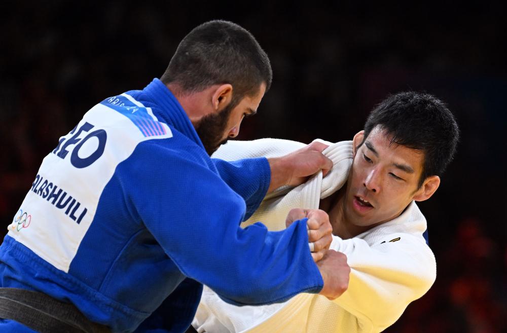 7月30日,日本选手永濑贵规(右)和格鲁吉亚选手格里加拉什维利在比赛中。 新华社记者 李安 摄