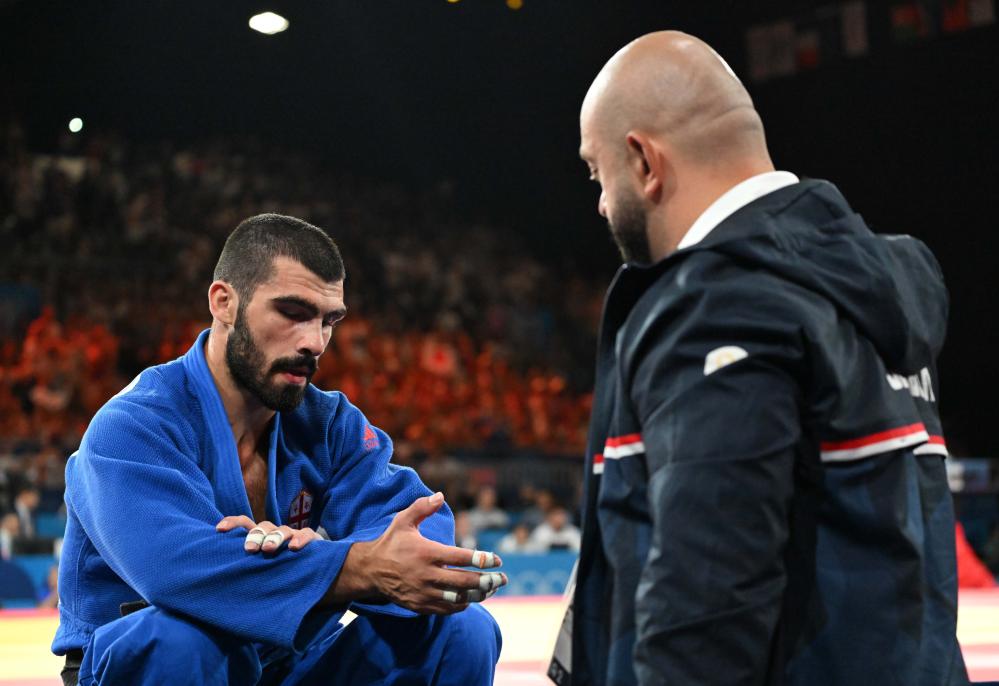7月30日,格鲁吉亚选手格里加拉什维利(左)在赛后。新华社记者 李安 摄